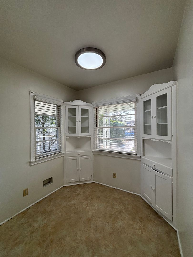 The kitchen comes fully equipped with a refrigerator and gas range and features a quaint kitchen nook with built-in cabinets, perfect for everyday breakfasts and casual meals. The open flow into the dining and living areas makes the space ideal for both entertaining and daily living.