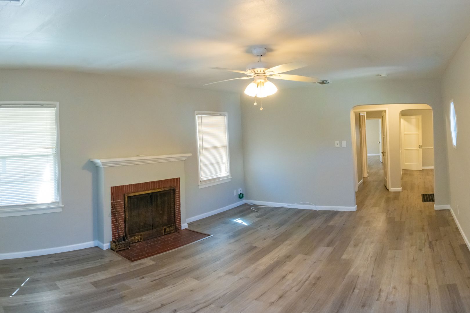 - Large living room with generous natural light, updated flooring, and a cozy, decorative fireplace.