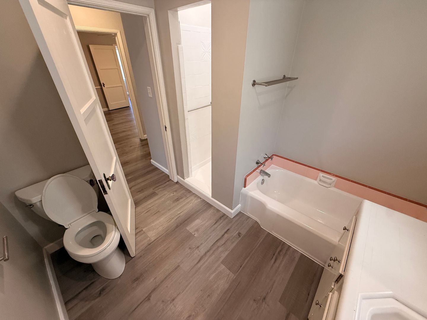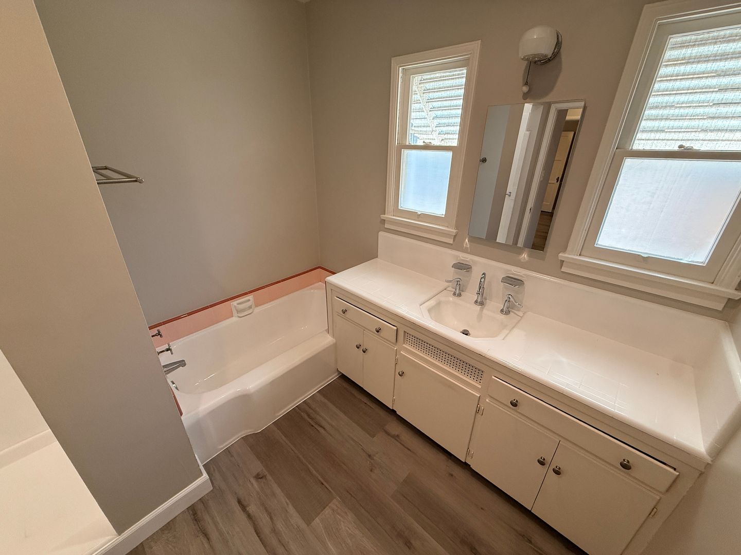 - Full bathroom with an extended vanity, dual storage cabinets, and a separate shower/tub area.