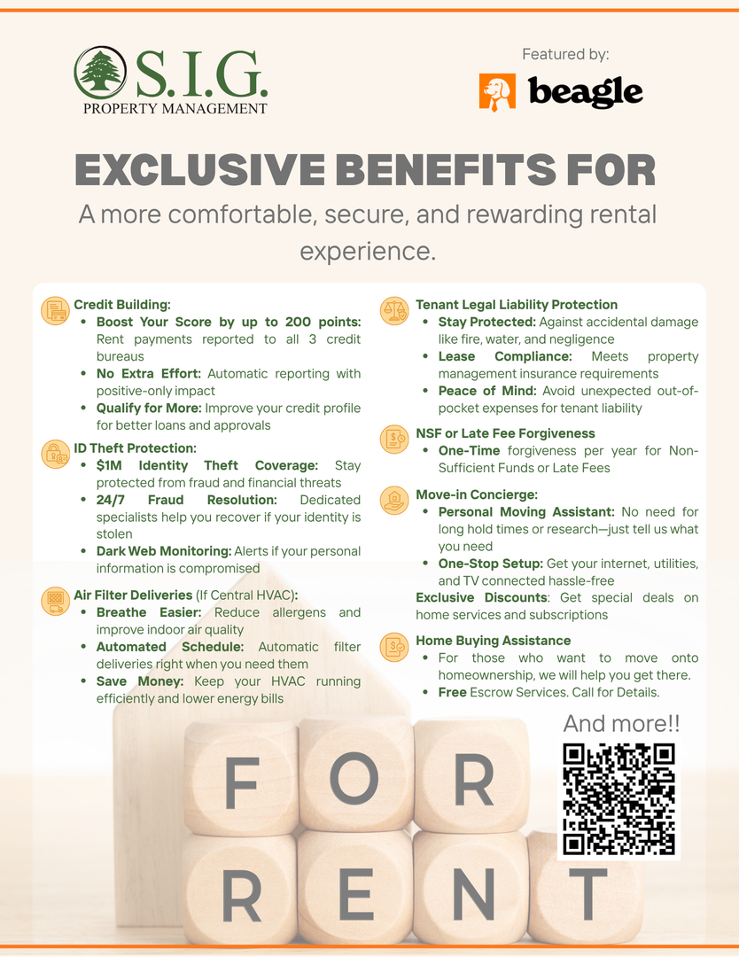 All S.I.G Property Management residents are enrolled in the Renters Kit (RBP) for $35.95/month which includes the required liability insurance as well as renters insurance to protect you, credit building to help boost your credit score with timely rent payments, up to $1,000,000 Identity Theft Protection, HVAC air filter delivery (for applicable properties), move-in concierge service making utility connection and home service setup a breeze during your move-in, our best-in-class resident rewards program and more!