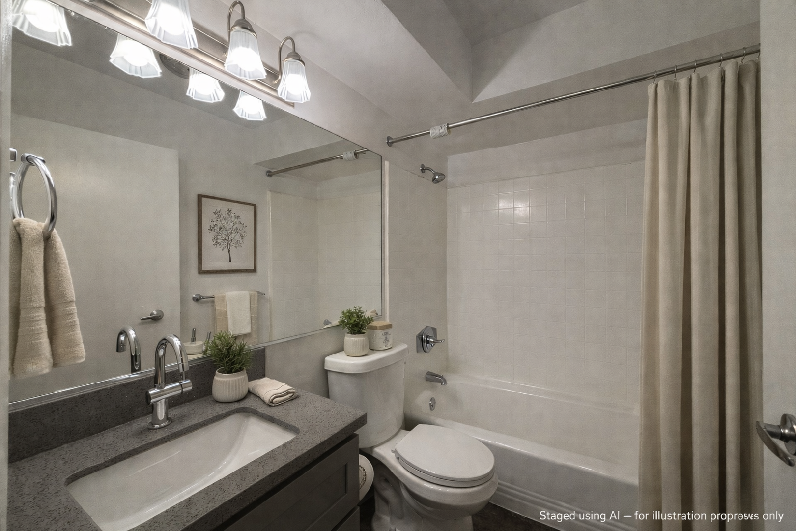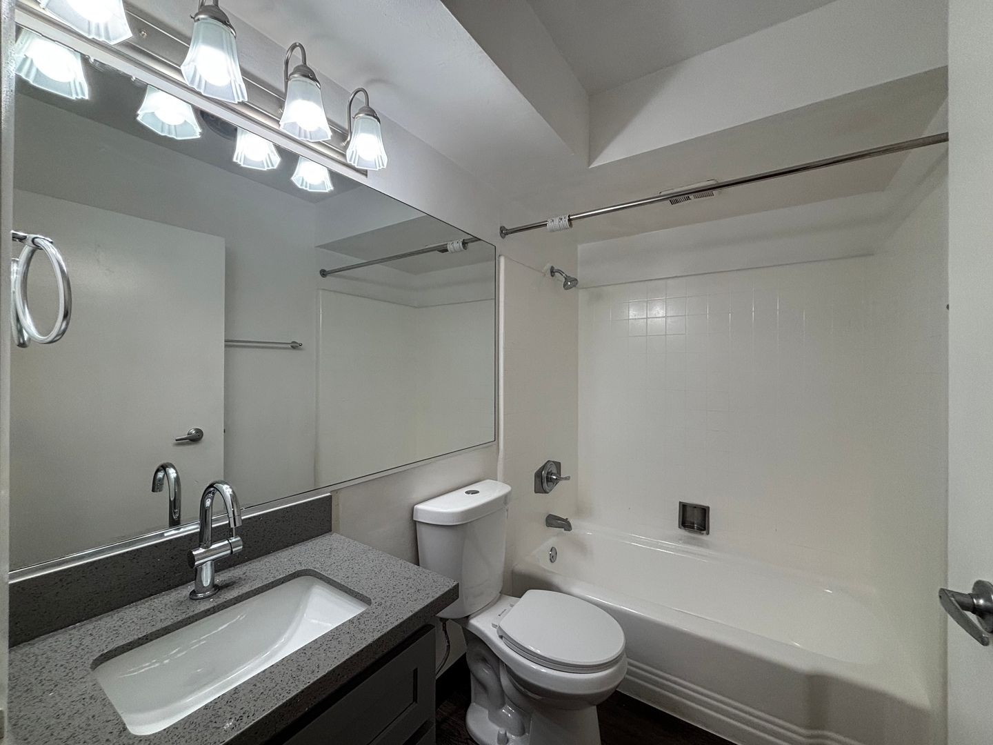 The bathroom features a clean and modern design with an updated vanity, contemporary fixtures, and a full bathtub with tiled enclosure.