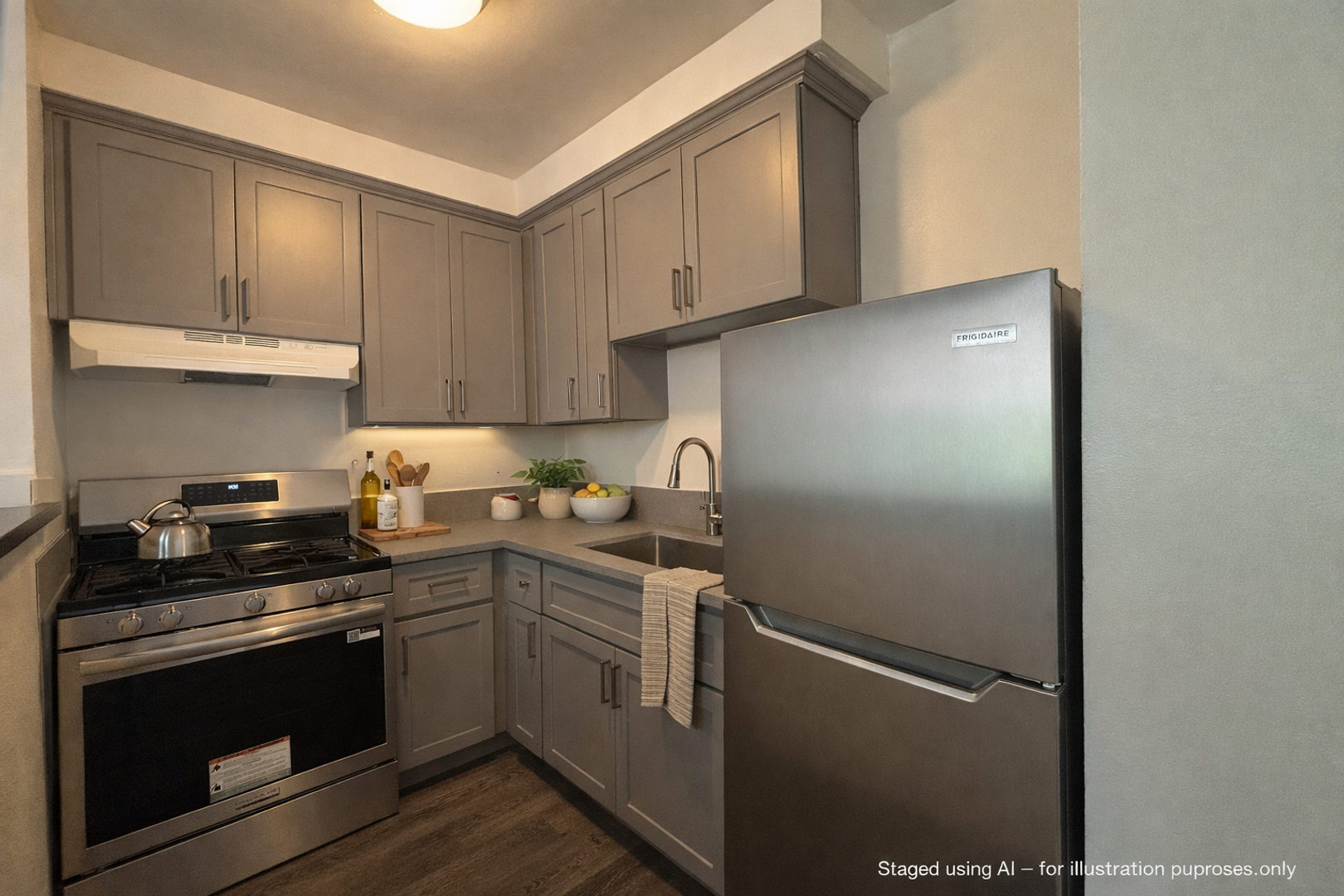 The kitchen has been tastefully upgraded with new grey shaker cabinetry, sleek crystal grey quartz countertops, and stainless steel appliances, including electric range/oven and refrigerator. A convenient breakfast bar provides additional counter space and seating.