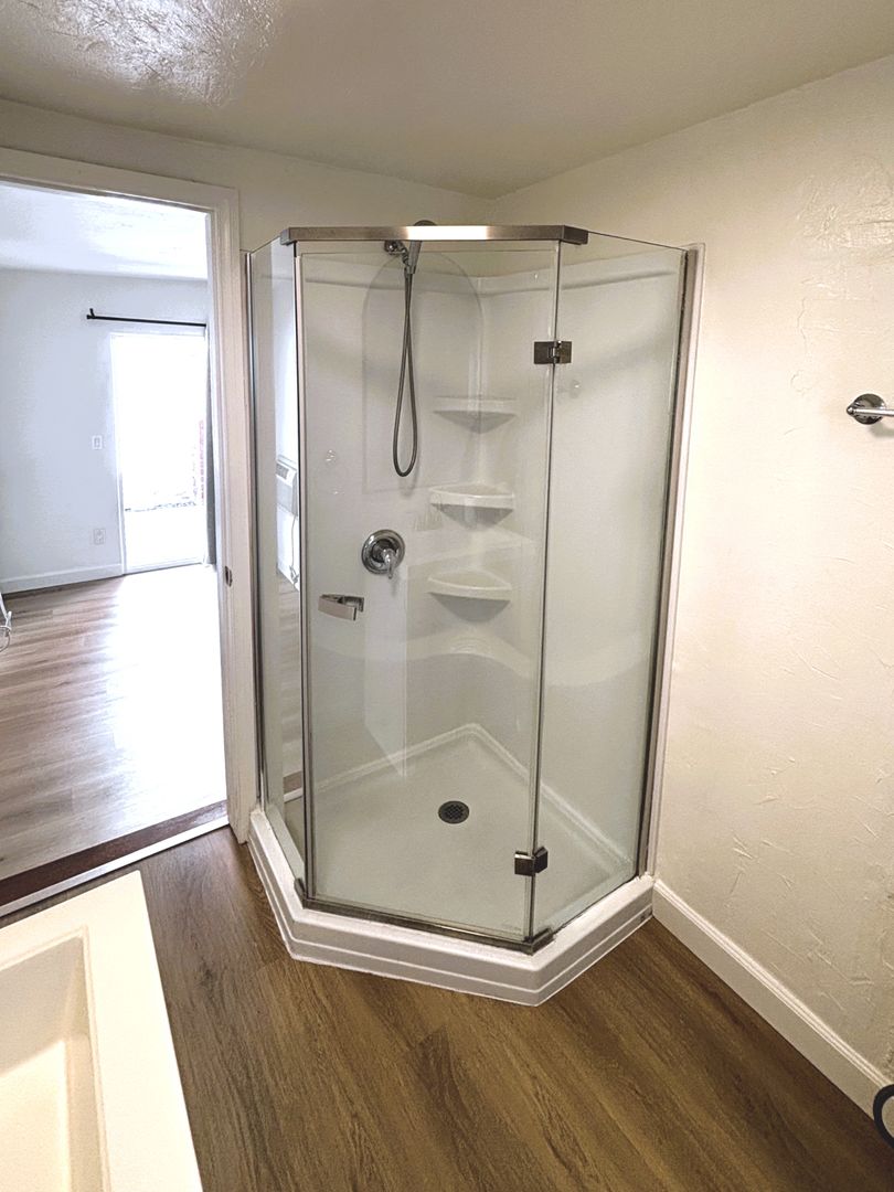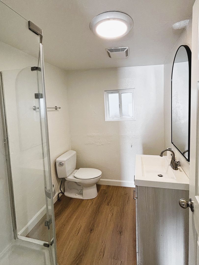 Bathroom: Recently redone with a newer vanity, a large decorative mirror, and a chic glass shower enclosure. Also features the new waterproof plank wood flooring.