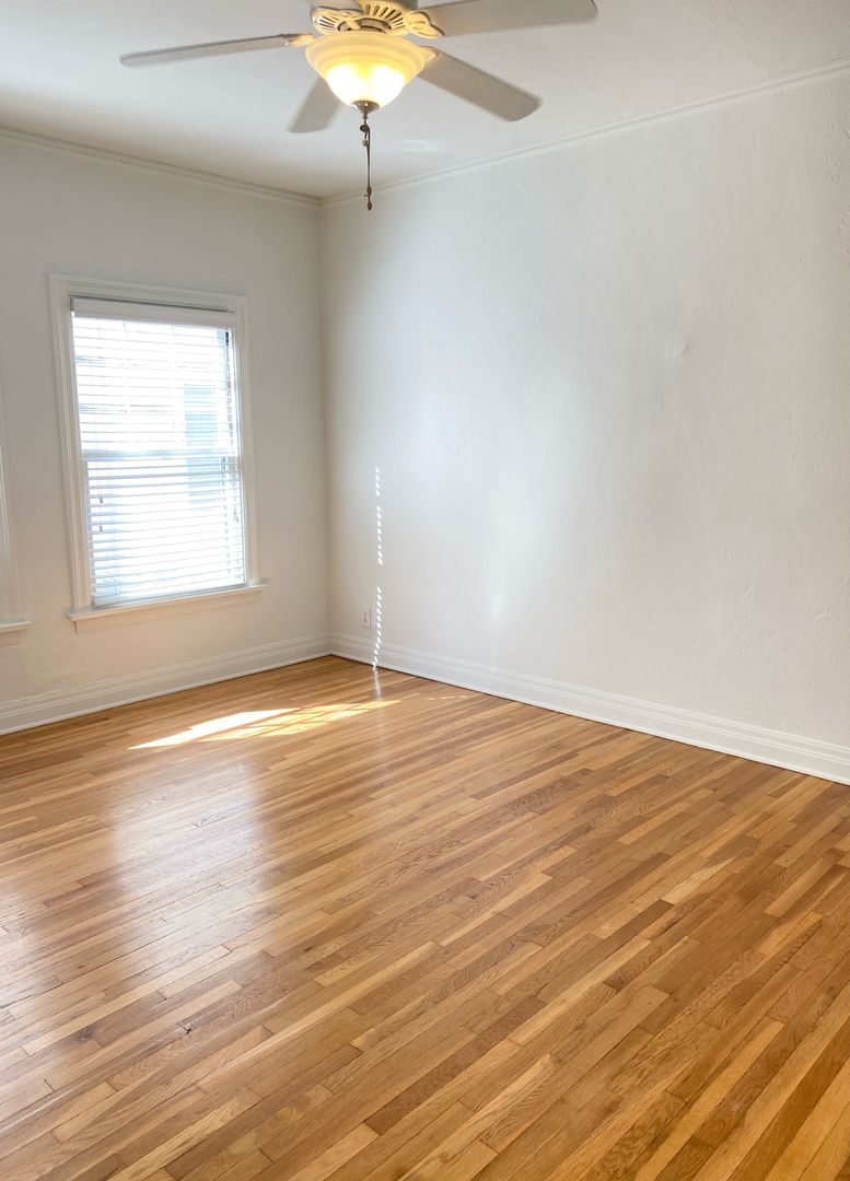 Enjoy gleaming refinished hardwood floors in the living areas, complemented by tile flooring in the kitchen and bathroom. Additional features include faux wood blinds throughout, a re-glazed bathtub, window A/C units in both the living room and bedroom, and a wall heater for year-round comfort.