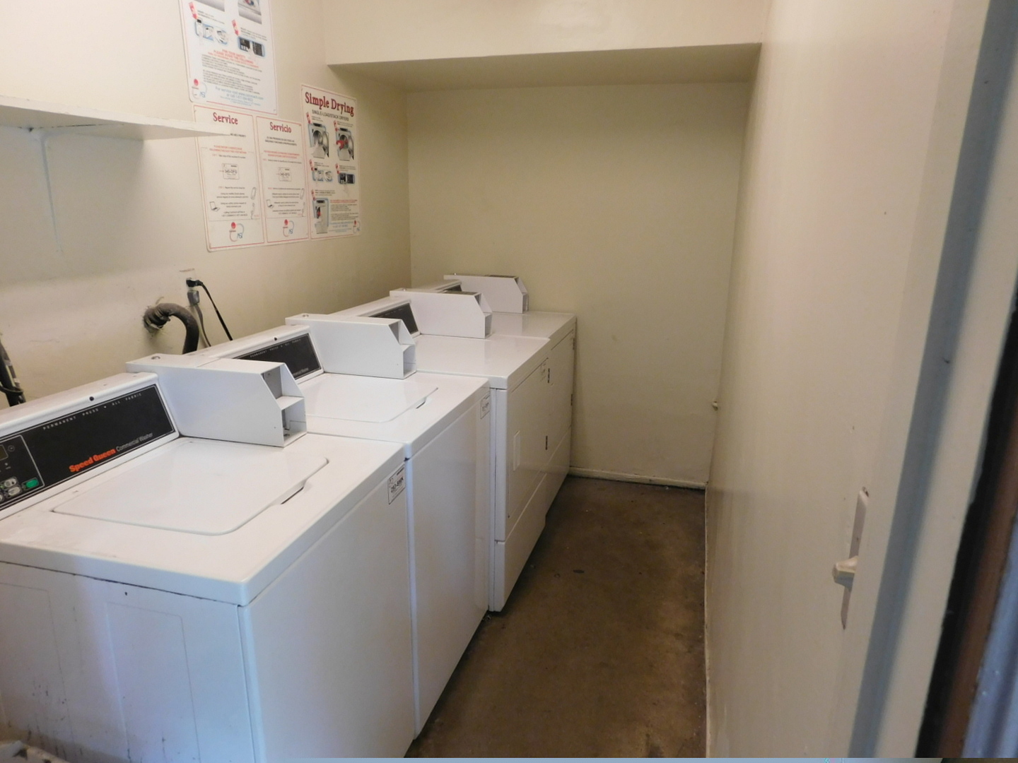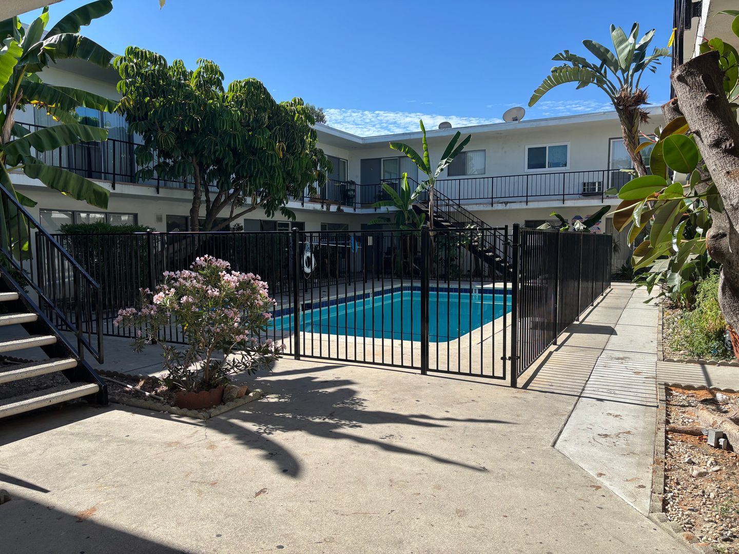 Upstairs 1 bedroom 1 bath: Unit features beautiful cabinetry with granite counters, stainless steel sink, stove/microwave and tile floor. Bathroom includes a large vanity, re-glazed tub and tile floor, living room has laminate floors, vertical blinds throughout unit, with a wall A/C. The building has an on-site laundry room with coin operated machines, a friendly and responsive on-site manager, a community BBQ area in the back, a swimming pool located in the center of the building surrounded by a lush tropical setting. 1 designated gated parking space, intercom entry and tenant only pays for electric bill (no gas or water). Sorry NO PETS.