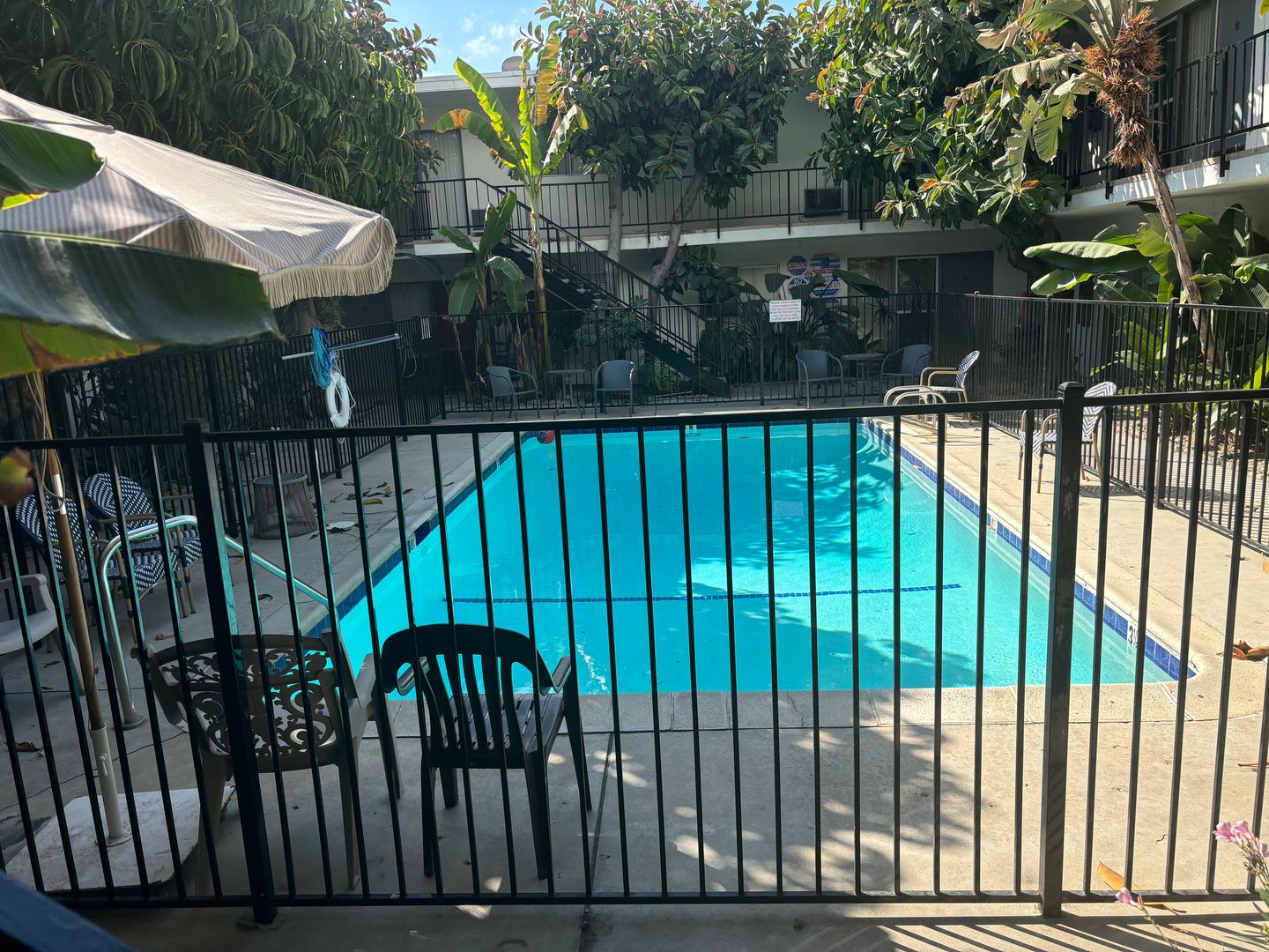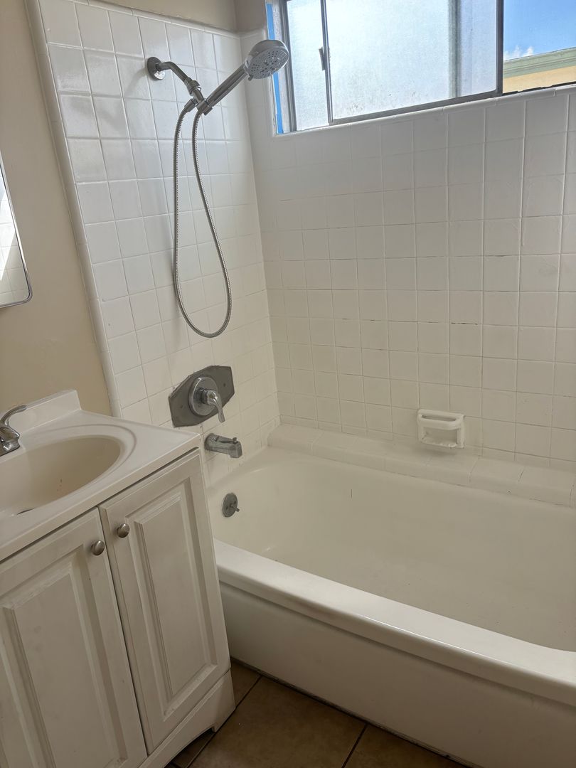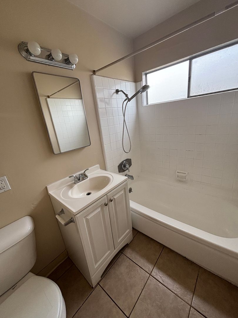 Upstairs 1 bedroom 1 bath: Unit features beautiful cabinetry with granite counters, stainless steel sink, stove, and tile floor. The bathroom to include a vanity, reglazed tub, and tile floor. Fresh paint, wood like flooring, and vertical blinds, throughout the unit, with a wall A/C. The building has an on-site laundry room with coin-operated machines, a friendly and responsive on-site manager, a community BBQ area in the back, and a swimming pool located in the center of the building surrounded by a lush tropical setting. 1 designated gated parking space, intercom entry, Sorry, NO PETS.
