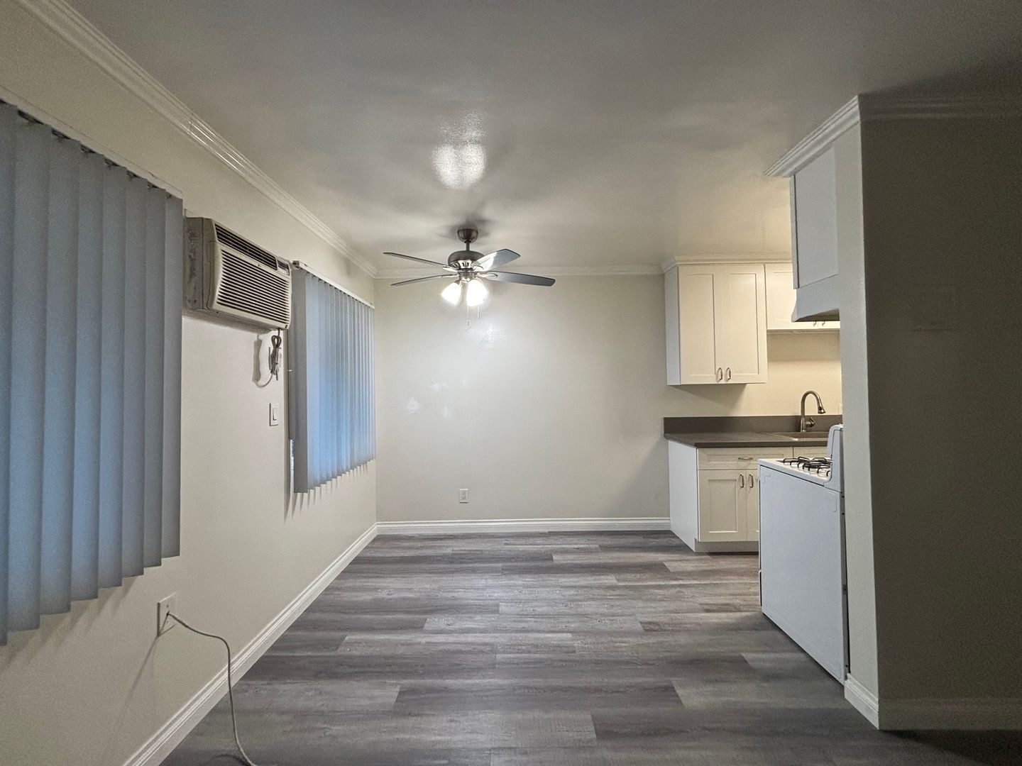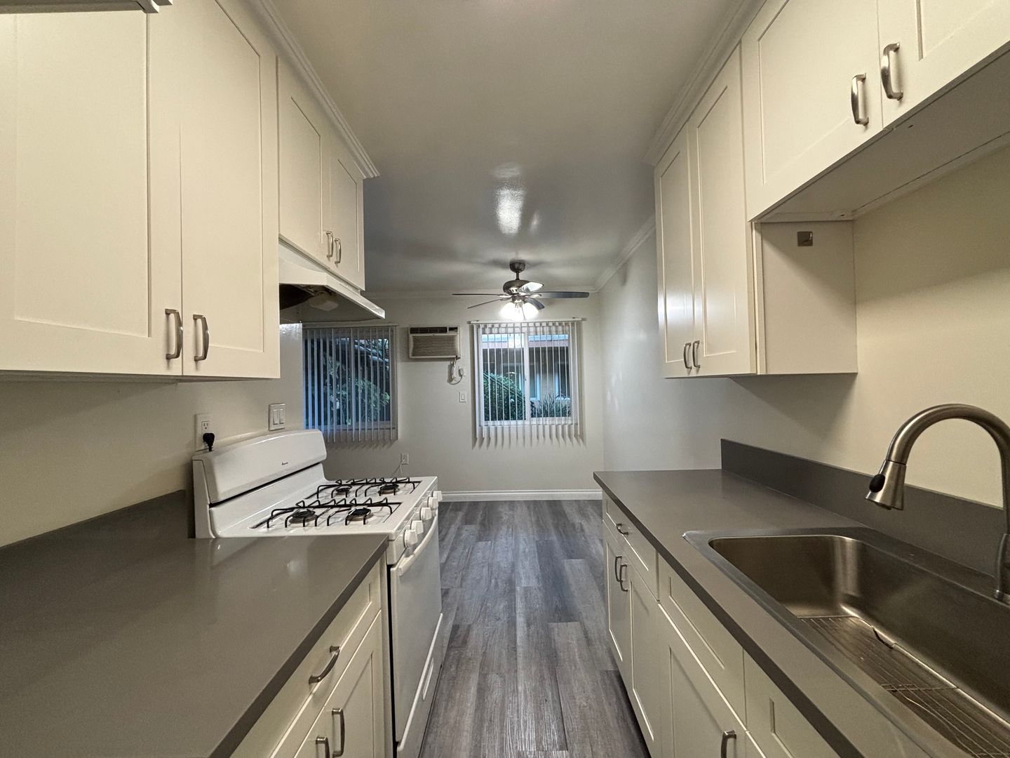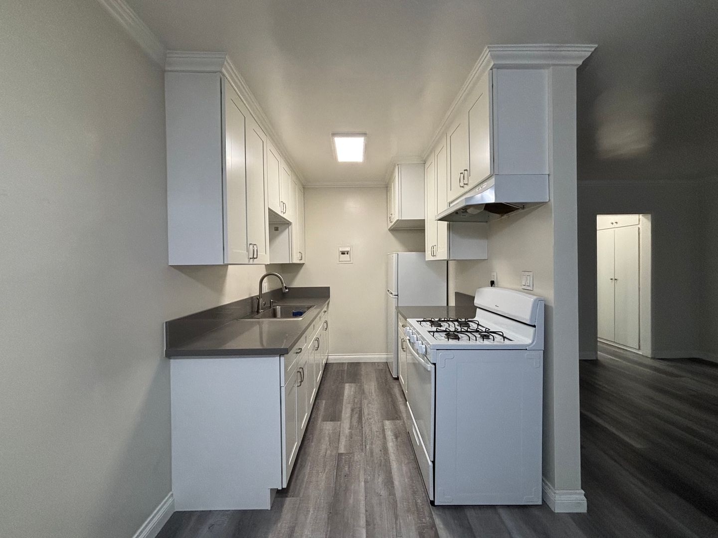 This charming apartment in Glendale's highly sought-after Mariposa neighborhood offers a comfortable and modern living space. The unit has a wall AC, a gas range/oven, a hood, and a refrigerator, making it perfect for everyday cooking. The updated kitchen features sleek white shaker cabinets, grey marble-like quartz countertops, and a stainless steel single sink with a gooseneck faucet.