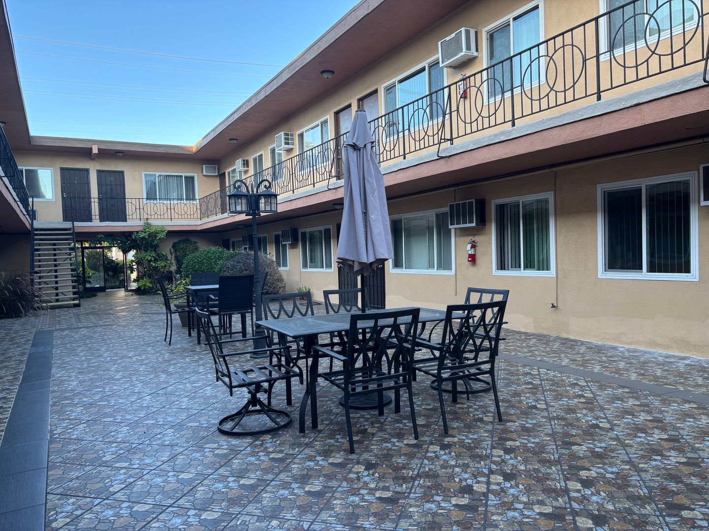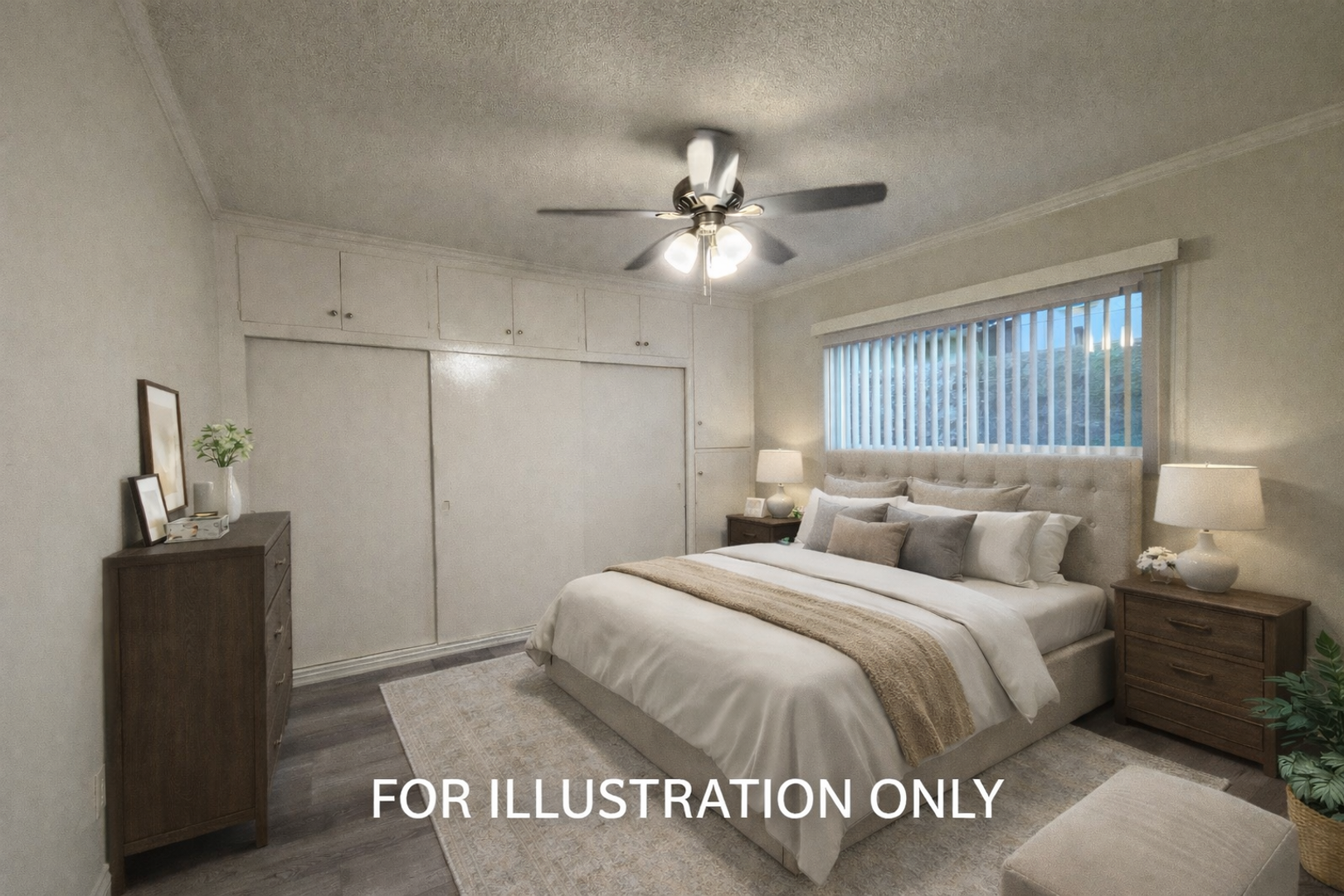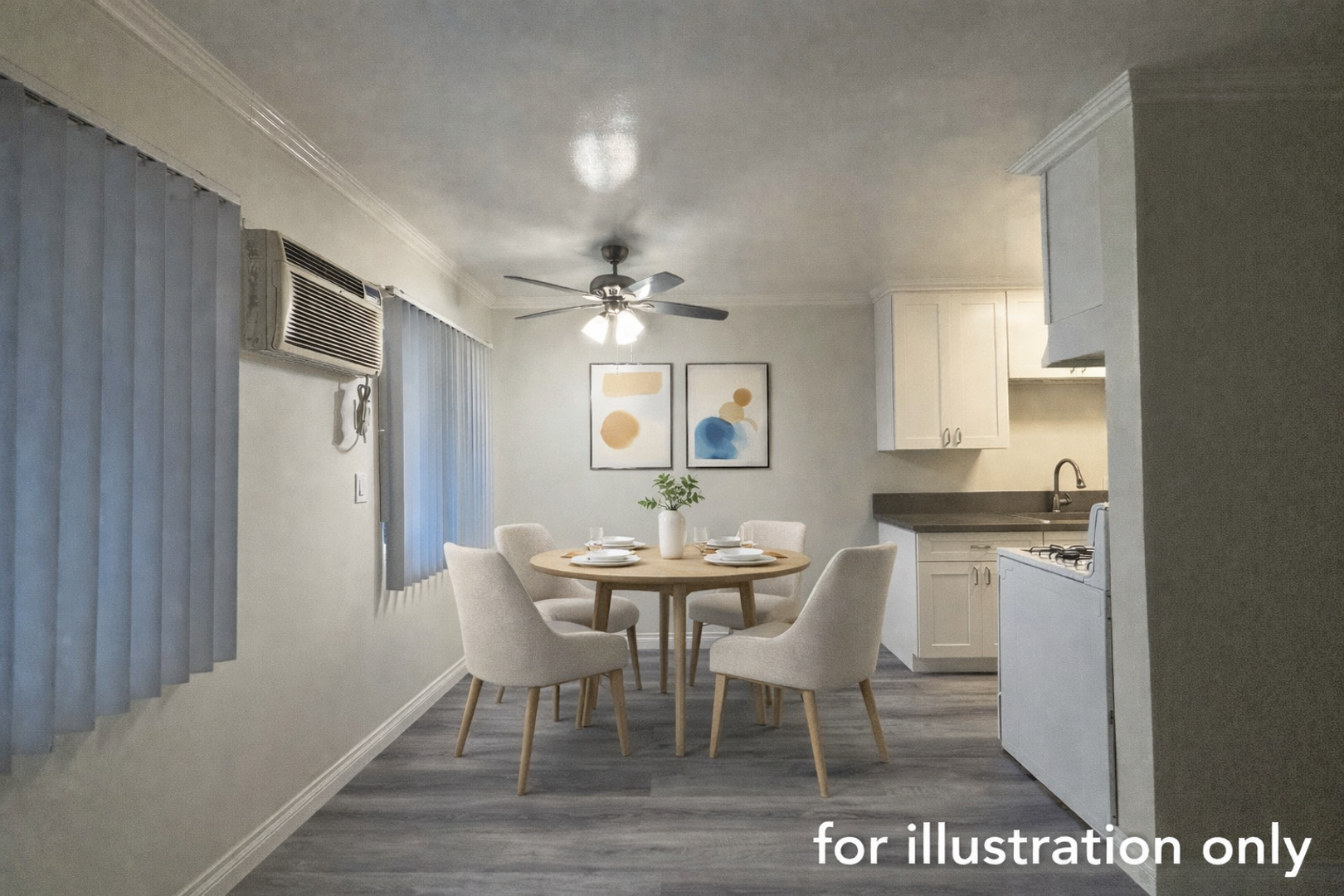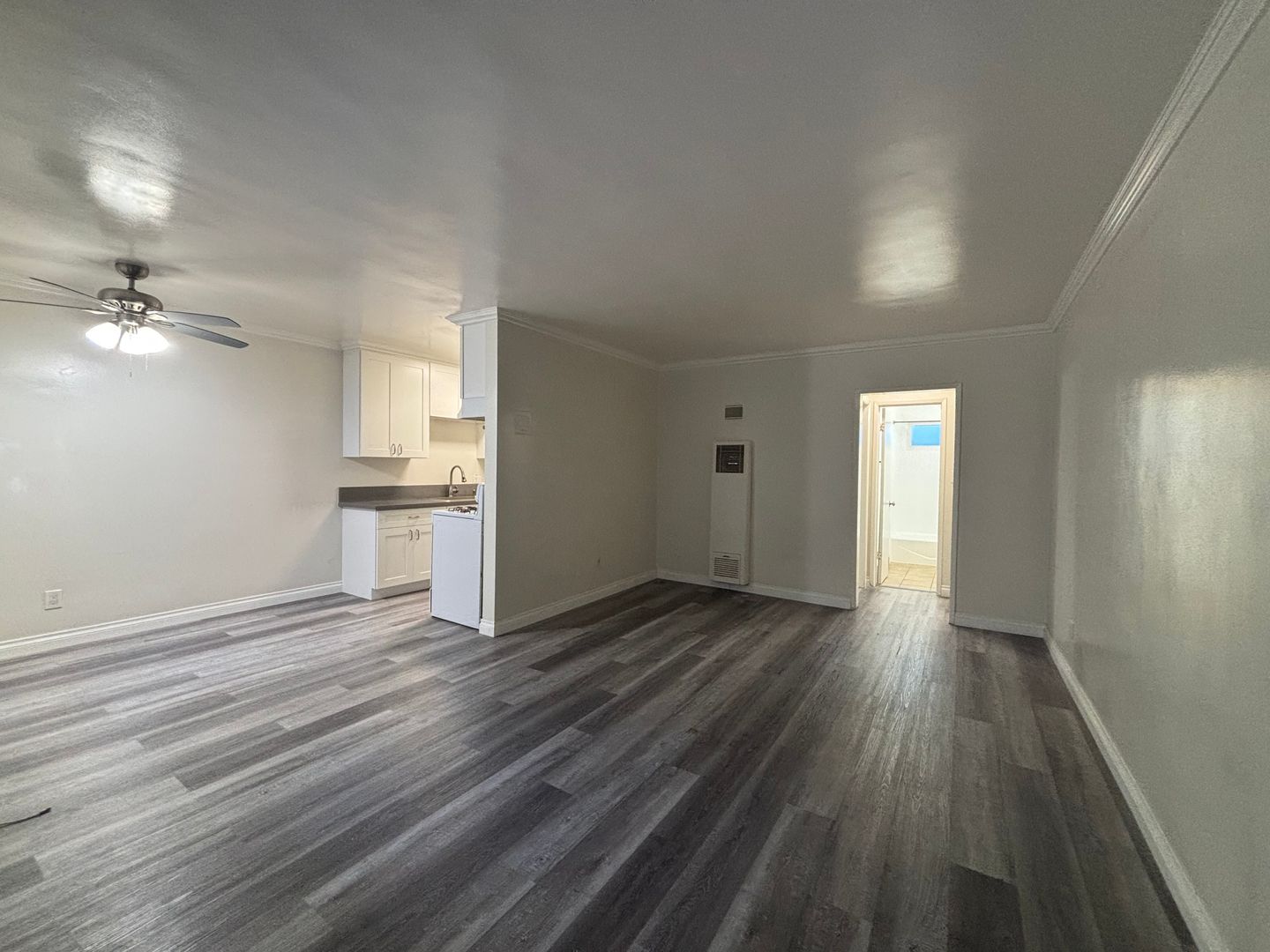 This charming apartment in Glendale's highly sought-after Mariposa neighborhood offers a comfortable and modern living space. The unit has a wall AC, a gas range/oven, a hood, and a refrigerator, making it perfect for everyday cooking. The updated kitchen features sleek white shaker cabinets, grey marble-like quartz countertops, and a stainless steel single sink with a gooseneck faucet.
